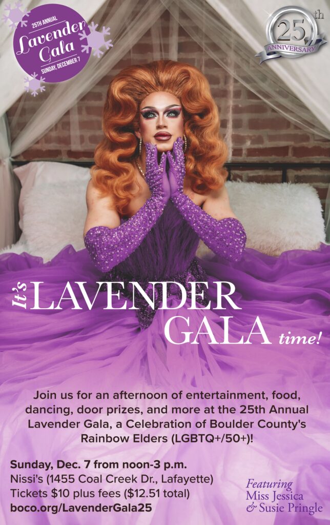 Join us at the 25th Annual Lavender Gala, a celebration of Boulder County’s Rainbow Elders (LGBTQ+/50+) for an afternoon of food, entertainment, dancing, door prizes, and more featuring Miss Jessica and Susie Pringle! All ages and identities welcome!